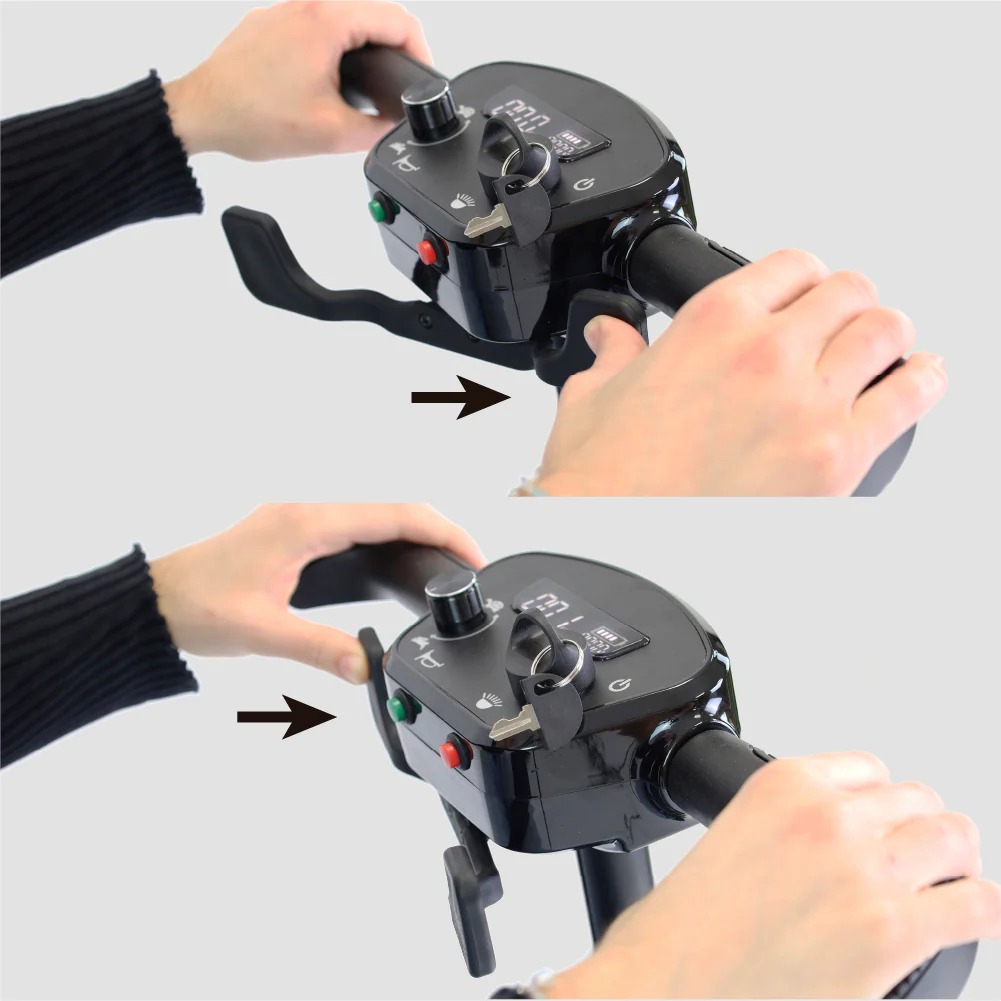 Sujeta el manillar con ambas manos. Para avanzar, tira lentamente de la palanca derecha con la mano derecha hacia ti. Para retroceder, haz lo mismo con la palanca izquierda y mano izquierda.